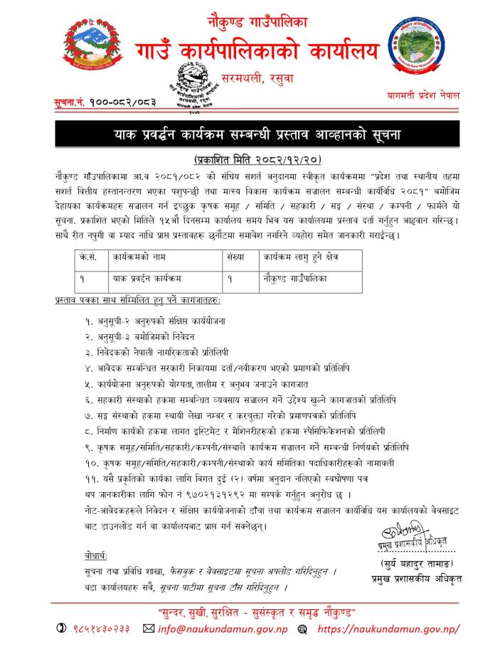 याक प्रवर्द्धन कार्यक्रम सम्बन्धी प्रस्ताव आव्हानको सूचना।