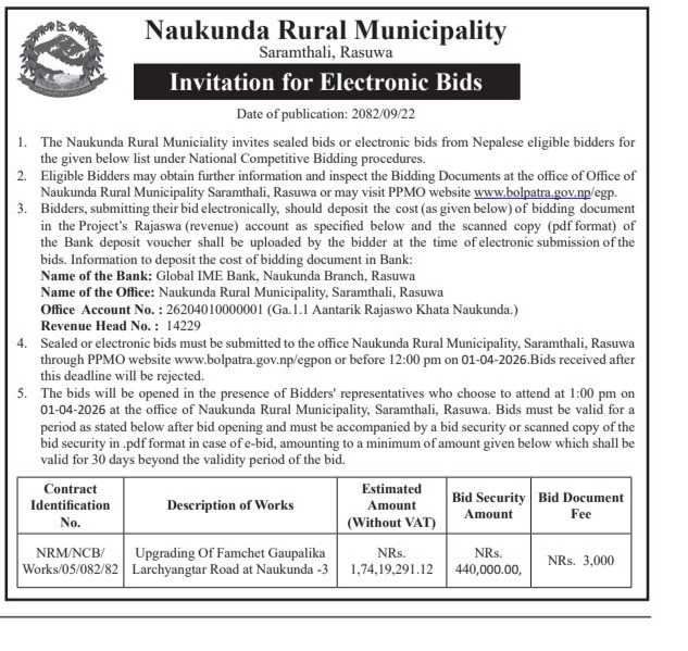 Invitation for Electronic Bids for Upgrading Of Famchet Gaupalika Larchyangtar Road at Naukunda -3