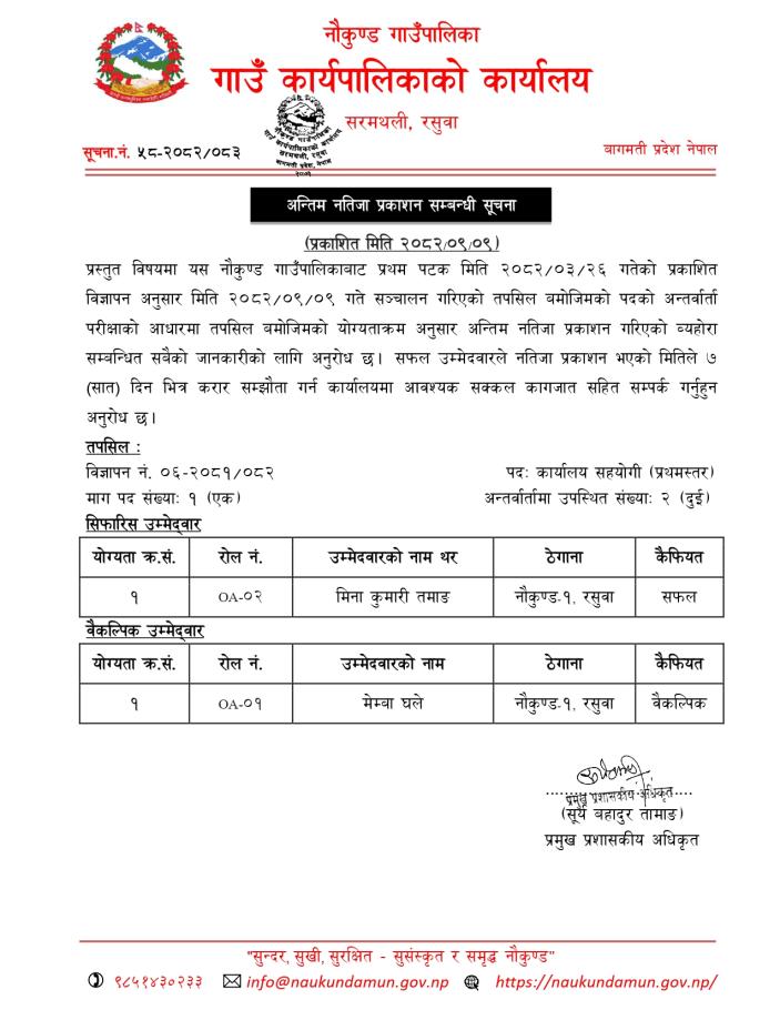 कार्यालय सहयोगीको अन्तिम नतिजा प्रकाशन सम्बन्धी सूचना ।