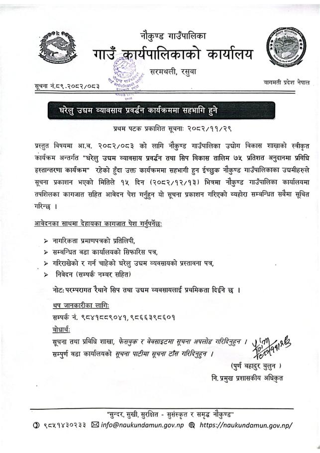 घरेलु उद्यम व्यावसाय प्रवर्द्धन कार्यकममा सहभागि हुने सूचना ।