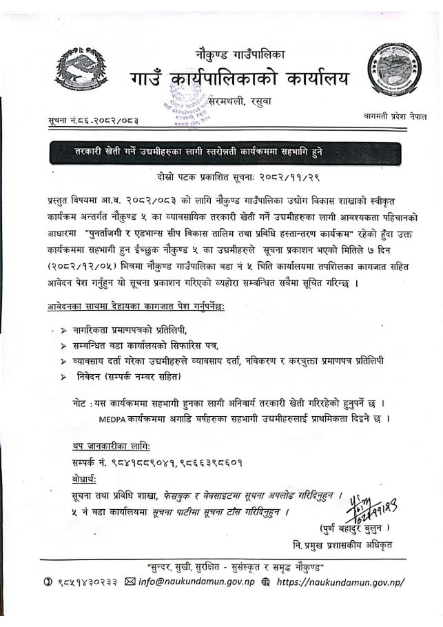» तरकारी खेती गर्ने उद्यमीहरुका लागी स्तरोन्नती कार्यक्रममा सहभागि हुने सम्बन्धी सूचना ।