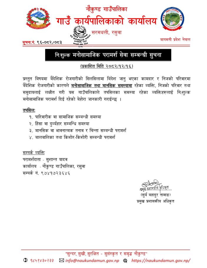 नि:शुल्क मनोसामाजिक परामर्श सेवा सम्बन्धि सुचना ।