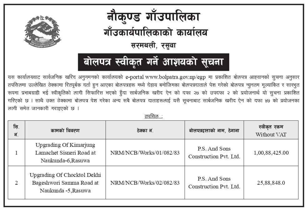 बोलपत्र स्वीकृत गर्ने आशयको सूचना ।