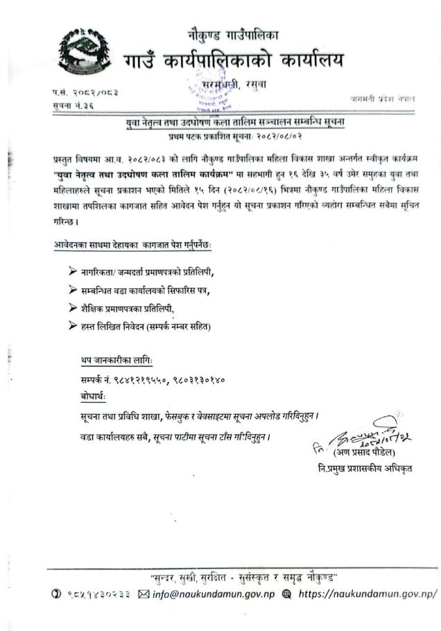 युवा नेतृत्व तथा उदघोषण कला तालिम सञ्चालन सम्बन्धि सूचना ।