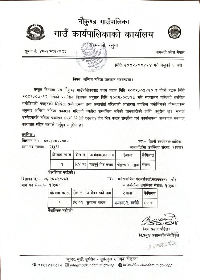रिटर्नी स्वयंसेवक (आंशिक) र मनोसामाजिक परामर्शकर्ता(सहायकस्तर पाचौ) पदको अन्तिम नतिजा प्रकाशन सम्बन्धमा।