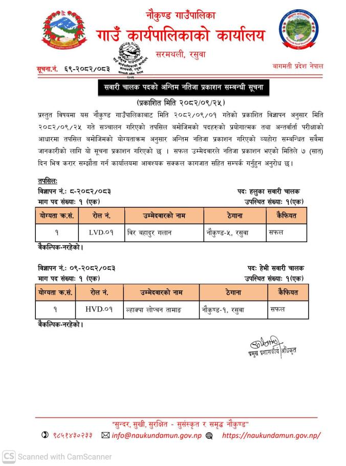 सवारी चालक पदको अन्तिम नतिजा सार्वजनिक सम्बन्धी सूचना।