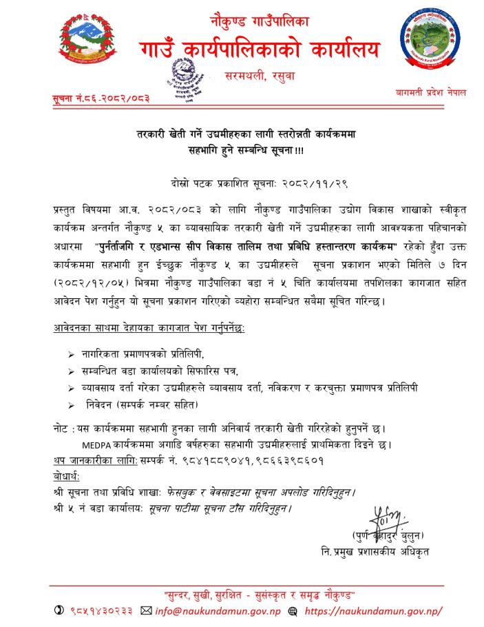 तरकारी खेती गर्ने उद्यमीहरुका लागी स्तरोन्नती कार्यक्रममा सहभागि हुने सम्बन्धी सूचना ।