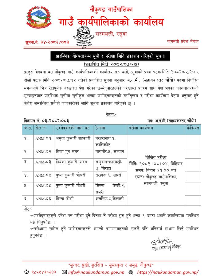 अ.न.मी. पदको प्रारम्भिक योग्यताक्रम र परीक्षा कार्यक्रम सम्बन्धमा ।