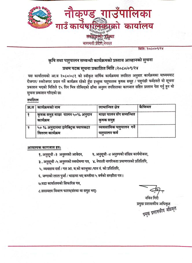 कृषि तथा पशुपालन सम्बन्धि कार्यक्रमको प्रस्ताव आह्वानको सूचना ।