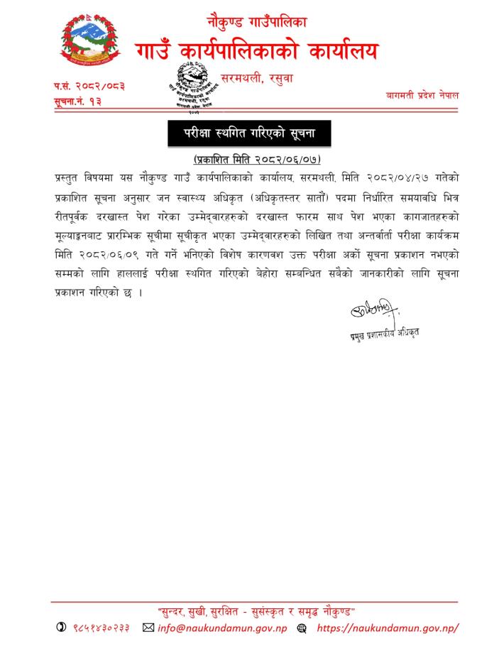 ज.स्वा.अ. पदको परीक्षा स्थगित गरिएको सूचना