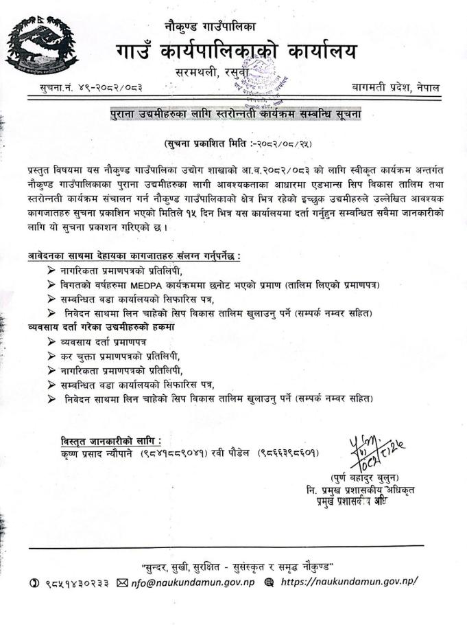 पुराना उद्मीहरुका लागि स्तरोन्नती कार्यक्रम सम्बन्धि सूचना ।