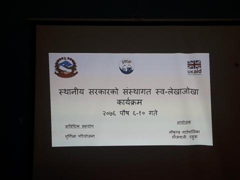 नौकुण्ड गाउँपालिकाको आयोजना तथा पूर्णिमा कार्यक्रमको प्राबिधिक सहयोगमा मिती २०७६ पौष ६ देखि १० गते सम्म नौकुण्ड गाउँपालिका,सरमथली रसुवामा स्थानिय सरकारको स्वमुल्यांकन तथा स्व लेखाजोखा कार्यक्रम सम्पन्न सम्बन्धि जानकारी |